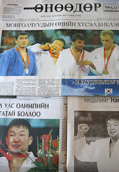 蒙古國選手奈丹·圖布辛巴亞爾14日在柔道100公斤級比賽中奪得金牌。這是蒙古國自1964年參加奧運會以來獲得的首枚金牌。14日夜至15日晨,蒙古國近萬名群眾在烏蘭巴托市中心廣場歡慶勝利,度過了不眠之夜。 “我們贏了!”“我們拿到金牌了!”這是市中心廣場上聽到最多的一句話。人們載歌載舞,歡呼聲不斷,更有市民流下激動的淚水。 一位名為額爾登的市民表示,這是蒙古國的大喜事,我們幾個朋友要備酒慶祝,我們太高興了。 晚9時左右,蒙古國總統、總理、議長一起來到市中心廣場!敖裉焱砩鲜遣幻呖駳g夜,”總統那木巴爾·恩赫巴亞爾在講話一開始就說,“蒙古國出了金牌運動員,這是我的榮幸,也是人民的榮幸,我們等待這一刻很久了!” 總理桑吉·巴亞爾搶過麥克風,高呼“蒙古國萬歲”,聲音因激動有些沙啞。廣場上響起震耳的歡呼聲。 蒙古國的這“三巨頭”領唱國歌,廣場上的氣氛接近沸騰。 當天,蒙古國總統下令授予圖布辛巴亞爾“功勛運動員”和“勞動英雄”稱號以及象征最高榮譽的“蘇赫巴托”勛章?偨y、總理和議長還分別發出賀電,代表全體人民向圖布辛巴亞爾表示感謝,并希望這枚金牌能帶動蒙體育事業發展至新的高峰。 據悉,圖布辛巴亞爾將獲得蒙政府的1.2億圖格里克(約合1萬美元)的獎金。蒙電信公司14日也決定免費向圖布辛巴亞爾提供“9999-9999”的電話號碼!9”對蒙古國人來說是一個吉祥的數字。 圖布辛巴亞爾是第一次參加奧運會,他2002年開始學習柔道,曾獲得亞錦賽亞軍和世界杯季軍。 蒙古國共獲得了29個北京奧運會參賽資格。13日,蒙射擊選手貢德格瑪獲得本次奧運會的首枚銀牌。在北京奧運會之前,蒙古國共獲得了15枚奧運獎牌,但沒有1枚金牌。