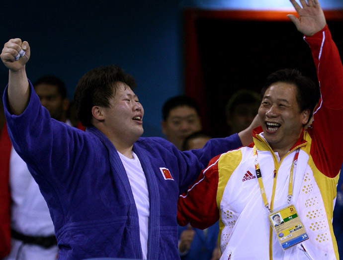 8月15日,佟文(左)在獲勝后興奮地歡呼。當日,在北京奧運會柔道女子78公斤以上級決賽中,中國選手佟文戰勝日本選手塚田真希,奪得冠軍。