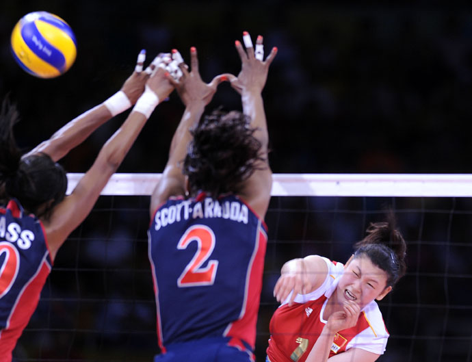 8月15日,在北京奧運會女子排球預賽A組(第23場)的比賽中,中國隊2比3惜敗美國隊。
