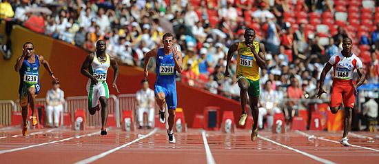 博爾特、蓋伊、鮑威爾,他們是當今男子百米的頂尖高手;劉翔、羅伯斯,他們是目前男子110米欄的佼佼者。此外,他們還有個共同的稱號——“飛人”。 8月15日,北京奧運會田徑項目的比賽終于拉開帷幕。 “飛人”聚集鳥巢,開始他們飛翔的精彩對決。 速度,是對奧林匹克格言“更快、更高、更強”最直白的詮釋;速度,是人類原始而恒久的追求。 那么,人類競速的極限何在?