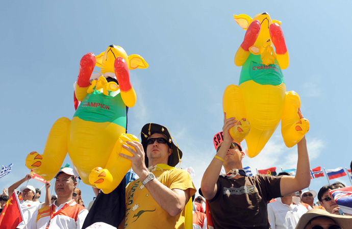 8月15日,兩名澳大利亞球迷手舉充氣袋鼠玩具在朝陽公園沙灘排球場為澳大利亞隊加油。當日,澳大利亞隊娜塔莉·庫克/塔姆辛·巴尼特以2比1戰勝希臘隊埃夫沙利婭·庫特魯馬尼祖/瑪麗亞·齊亞爾齊亞尼,晉級八強。