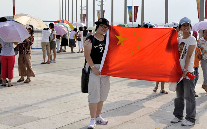 8月15日,兩位青島市民打出五星紅旗為中國運動員加油。