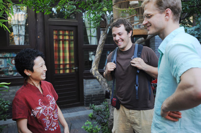 8月15日,什剎海大金絲胡同12號“奧運人家”女主人王志喜用流利的英文向美國游客介紹中國建筑文化。8月8日北京奧運會開幕后,北京市的“奧運人家”成為中外游客的關注焦點。位于什剎海附近的“奧運人家”游客絡繹不絕,游客在這里能夠深切感受到老北京所特有的皇城文化與傳統特色。