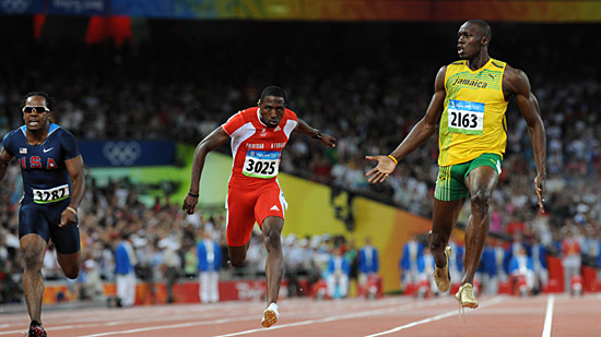 一股黑色旋風瞬間掠過“鳥巢”的紅色跑道,牙買加“奇人”博爾特最終用實力證明他是世界上跑得最快的人。 16日晚,在全場驚爆的歡呼聲中,他僅用了9秒69的時間到達了100米跑道的終點,并刷新了自己2個多月前創下的9秒72的世界紀錄,一舉奪得北京奧運會男子100米冠軍。 特立尼達和多巴哥的湯普森以9秒89摘得銀牌;美國人迪克斯贏得銅牌,成績為9秒91。 16日晚在“鳥巢”內上演的“飛人大戰”決賽,幾乎成了博爾特一個人的表演。而就在兩個多月前,博爾特剛以9秒72打破了鮑威爾9秒74的世界紀錄。 在半決賽中跑出9秒85的博爾特,當晚站在“飛人大戰”決賽第4道。決賽中,22歲的博爾特并未給對手以機會,如同離弦之箭第一個沖向百米跑道的終點。 他的同胞、前世界紀錄保持者鮑威爾則排名第五,成績為9秒95。 半決賽16位選手中,有6位跑進了10秒大關,進入男子100米決賽的門檻為10秒03。賽前的奪冠熱門、美國“飛人”蓋伊在半決賽中僅跑出10秒05的成績,排位小組第五,無奈憾別“飛人大戰”決賽跑道。