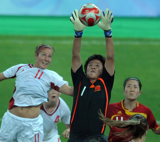 8月10日,中國隊守門員張艷茹在比賽中摘球。當日,在天津奧林匹克中心體育場舉行的北京奧運會女足小組賽中,中國隊與加拿大隊1比1戰平。