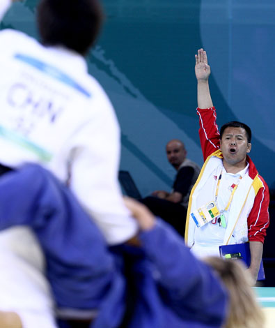 8月10日,中國女子柔道運動員冼東妹的教練傅國義在比賽現場指導。冼東妹在北京奧運會女子柔道52公斤級決賽中戰勝朝鮮選手安琴愛,成功衛冕柔道奧運會冠軍,創造了中國體育的歷史。