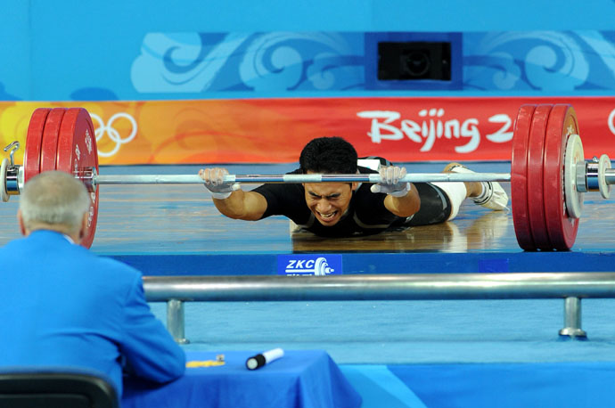 8月12日,雅典奧運會男子舉重69公斤級亞軍得主、韓國選手李培永在北京奧運會舉重男子69公斤級決賽挺舉比賽中失誤,但仍緊緊抓住杠鈴。李培永在挺舉的三次試舉中,因為第一舉受傷而導致最后兩舉功敗垂成,與獎牌失之交臂。