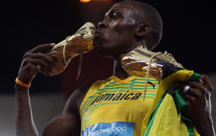 8月16日,牙買加選手尤塞恩·博爾特賽后親吻戰靴。