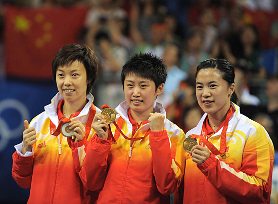 在17日晚舉行的北京奧運會乒乓球女子團體決賽中,中國隊擊敗新加坡隊獲得金牌。 第一盤由中國隊的王楠對陣新加坡隊的馮天薇,王楠在先失一局的情況下連扳三局,以3:1戰勝對手為中國隊拿下第一分。 第二盤比賽中,世界排名第一的張怡寧出場,迎戰世界排名第六的新加坡名將李佳薇。張怡寧延續了隊友王楠的獲勝軌跡,第一局9:11失利,然后連勝三局,以3:1取得第二盤的勝利。 在第三盤雙打比賽中,由中國隊的張怡寧/郭躍對陣新加坡隊的李佳薇/王越古,張怡寧/郭躍直落三局以3:0取勝。 中國隊最終以總比分3:0戰勝新加坡隊,獲得北京奧運會乒乓球女子團體金牌。