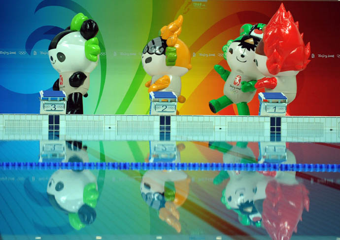 8月17日,福娃“晶晶”、“迎迎”、“妮妮”和“歡歡”(從左至右)為選手助威。當日,北京奧運會女子3米跳板決賽在國家游泳中心——“水立方”舉行。
