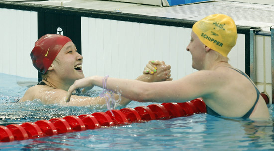 8月14日,中國選手劉子歌(左)接受澳大利亞選手斯基佩爾的祝賀。當日,劉子歌在女子200米蝶泳決賽中以2分04秒18的成績創造新的世界紀錄并奪得冠軍。新華社記者:費茂華