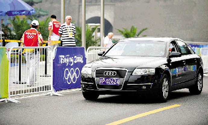 >> 上海大眾汽車將奧運官員們送達長城腳下