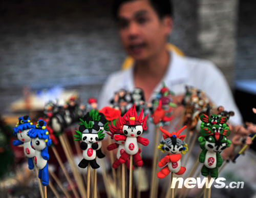 8月17日,京城百工坊里的民間工藝大師制作的面人福娃。