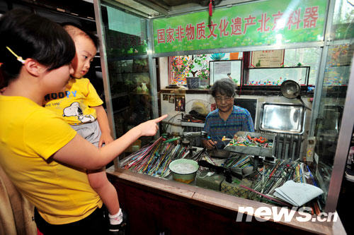 8月17日,一位市民帶孩子觀看百工坊里的民間工藝大師手工琉璃制作。