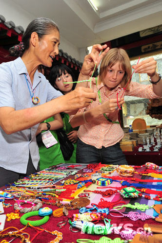8月17日,一名在百工坊采訪的外國記者向民間工藝大師學習打“中國結”。