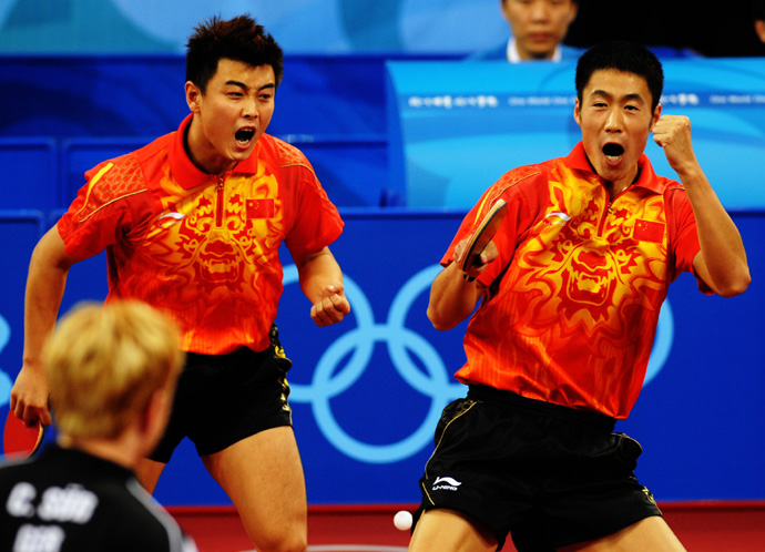 8月18日,中國選手王皓(左)/王勵勤慶祝勝利。當日,中國隊在北京奧運會乒乓球男子團體決賽中以3比0戰勝德國隊,摘得金牌。