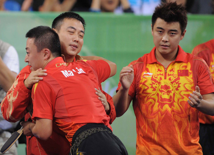 8月18日,中國選手馬琳(左一)獲勝后和主教練劉國梁擁抱。當日,中國隊在北京奧運會乒乓球男子團體決賽中以3比0戰勝德國隊,摘得金牌。