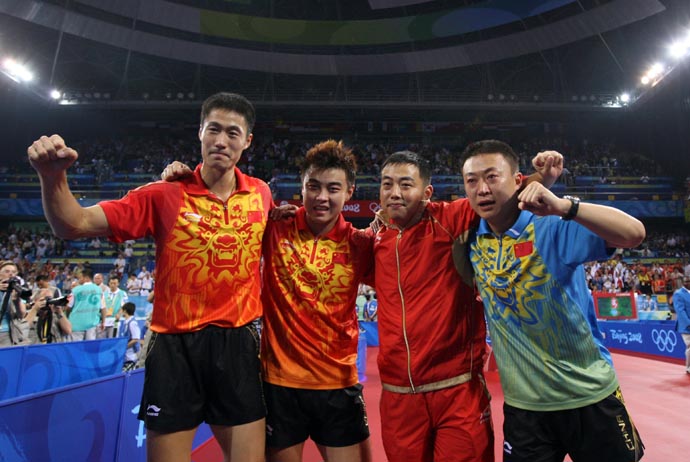8月18日,中國男隊主教練劉國梁(右二)、隊員馬琳(右一)、王皓(左二)、王勵勤賽后合影。當日,中國隊在北京奧運會乒乓球男子團體決賽中以3比0戰勝德國隊,摘得金牌。
