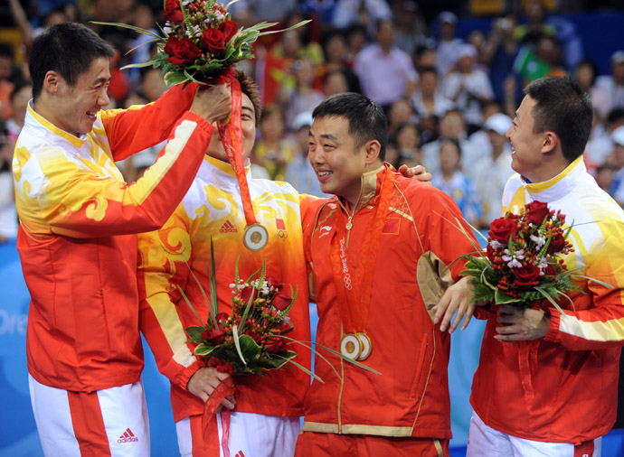 8月18日,中國隊員馬琳(右一)、王皓(左二)、王勵勤(左一)把金牌掛到主教練劉國梁的脖子上。當日,中國隊在北京奧運會乒乓球男子團體決賽中以3比0戰勝德國隊,摘得金牌。