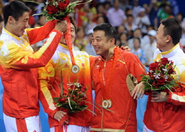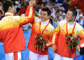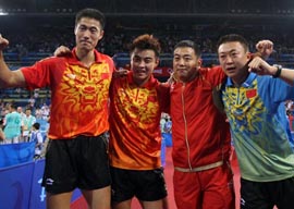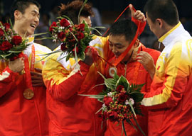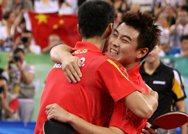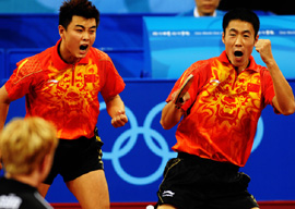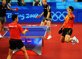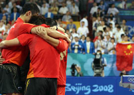 8月18日,中國隊在北京奧運會乒乓球男子團體決賽中以3比0戰勝德國隊,摘得金牌。