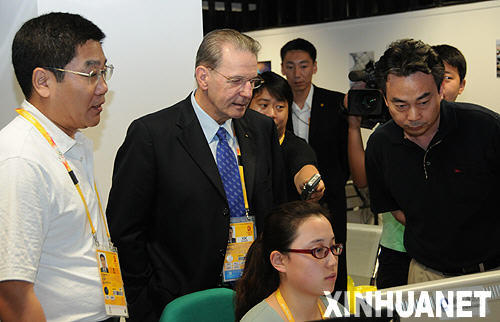 國際奧委會主席羅格(中)14日上午參觀位于北京奧運會主新聞中心的新華社奧運前方報道團,圖為新華社副總編輯彭樹杰(右)向羅格介紹新華社奧運報道情況。新華網記者 胡孝乾