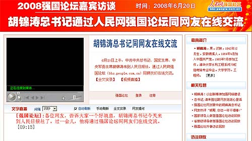 人民網直播胡錦濤總書記與網友在線交流(網頁截屏)
