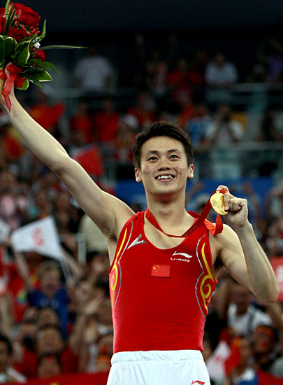 8月19日,中國選手陸春龍在頒獎儀式上慶祝。當日,在國家體育館進行的北京奧運會男子蹦床決賽中,陸春龍以41.00分的成績奪得冠軍。