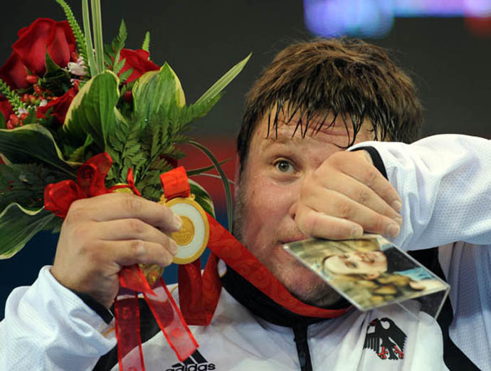 8月19日,德國選手馬蒂亞斯·施泰納在舉重男子105公斤以上級決賽中以461公斤的總成績摘得金牌。圖為馬蒂亞斯·施泰納在領獎臺上手持金牌、鮮花和妻子的照片喜極而泣。