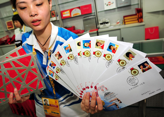 當日,“第29屆奧運會中國體育代表團奪金紀念”郵品在北京奧運村的中國郵政代辦點開始發售。郵品中的紀念封正面印有運動員比賽精彩瞬間和賽場圖片,加蓋奧運場館郵戳,并貼有奪金運動員個性化郵票。