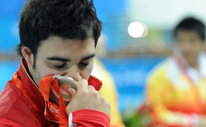 8月19日,加拿大選手德斯帕蒂親吻獎牌。當日,北京奧運會跳水比賽在國家游泳中心——“水立方”繼續進行,德斯帕蒂在男子3米跳板決賽中以536.65分的成績獲得亞軍。