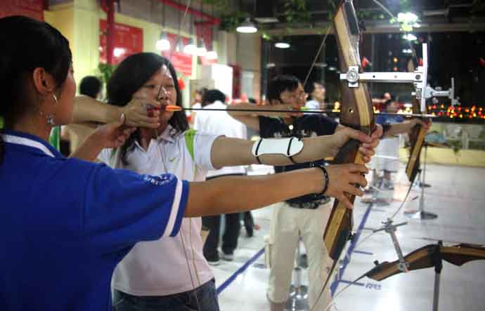 8月19日,幾位業余射手在北京東方巨龍射箭館練習。據這個射箭館的工作人員介紹,由于中國女子射箭在北京奧運會上取得歷史性突破,北京射箭愛好者近日逐漸增多。他們紛紛來到向社會開放的射箭場館一試身手。