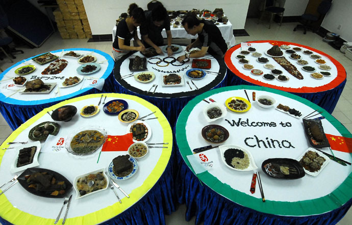 8月19日拍攝的“奧運石頭宴”。 近日,一組由水晶石、玉石等各類石頭擺成的“奧運石頭宴”亮相上海,慶祝北京奧運會成功舉辦。