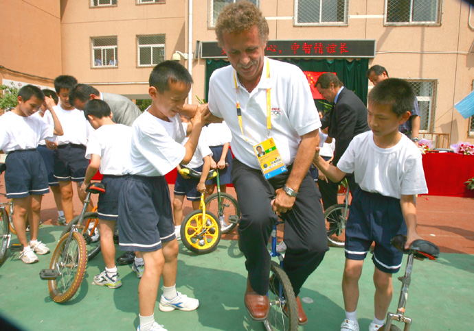 8月19日,智利代表團團長海梅·阿利亞蒂在西羅園五小學生的幫助下,學習騎獨輪車。當日,幾位參加北京奧運會的智利客人來到“同心結”學!髁_園五小參觀,向孩子們學習剪紙、捏面人和書法等中國傳統藝術。