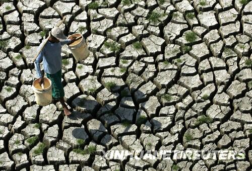 8月20日,在印度尼西亞東爪哇省的拉蒙岸,為牲畜取水的村民手持空桶走過干涸的水壩。新華社/路透