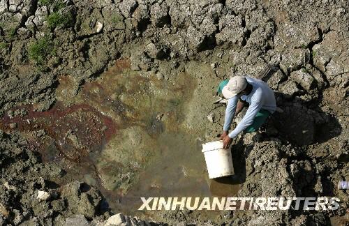 8月20日,在印度尼西亞東爪哇省的拉蒙岸,一村民用塑料桶在幾乎干涸的水壩中汲水。新華社/路透