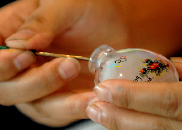 8月20日,北京民間藝術家正在制作內畫鼻煙壺。