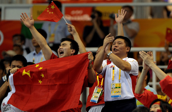 8月20日,中國跆拳道隊總教練陳立人(白衣)在北京奧運會跆拳道女子49公斤級比賽中,為弟子吳靜鈺加油。