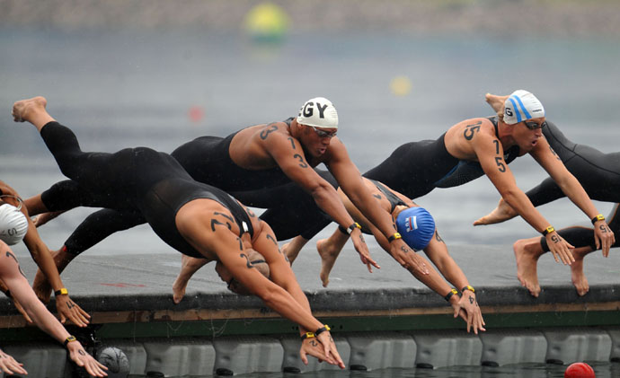 8月21日,選手們在男子10公里馬拉松游泳比賽中出發。當日,北京奧運會男子10公里馬拉松游泳比賽在順義奧林匹克水上公園冒雨進行。