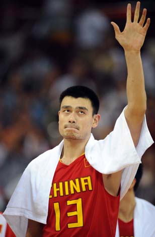 8月20日,中國隊隊員姚明在向觀眾致意。