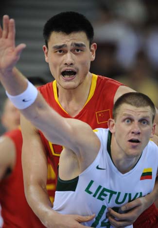 8月20日,中國隊隊員姚明(上)在比賽中防守對方球員。