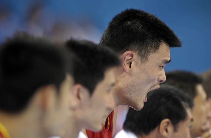 8月20日,在北京五棵松奧林匹克籃球館進行的北京奧運會男籃1/4決賽中,中國隊以68比94不敵立陶宛隊。這是中國男籃隊員姚明在場邊吶喊。
