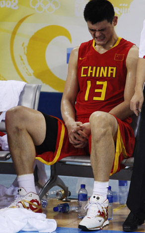 中國隊隊員姚明在比賽后的表情(8月20日攝)。