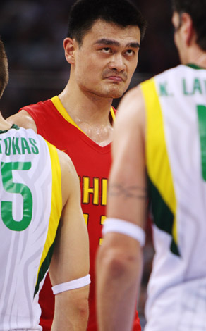 中國隊隊員姚明在比賽中的表情(8月20日攝)。