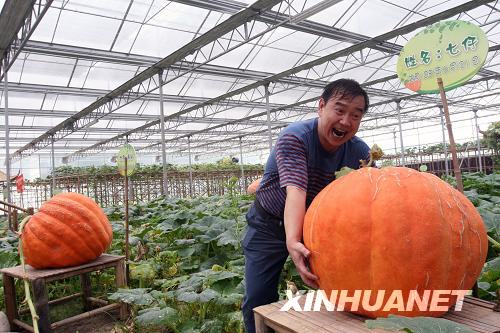 8月20日,在北京觀光南瓜園,一位男士與巨型南瓜合影。