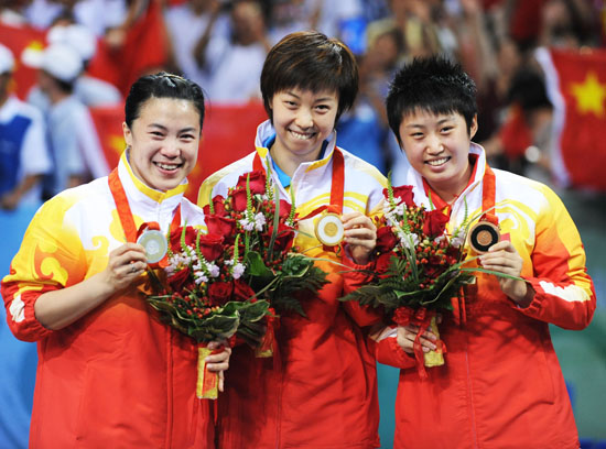 8月22日,中國選手張怡寧(中)、王楠(左)、郭躍在領獎臺上。當日,張怡寧、王楠、郭躍在北京奧運會乒乓球女子單打決賽中分獲金、銀、銅牌。