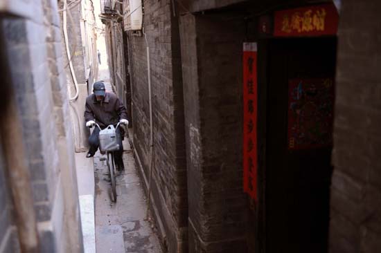 一名騎車人在狹窄的錢市胡同中穿行。本報記者:張領