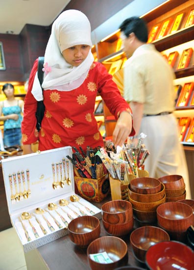 外國游客在大柵欄筷子商店里選購筷子。本報記者:何俊昌