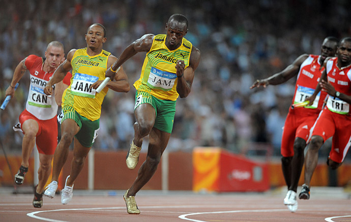 8月22日,牙買加隊選手尤塞恩·博爾特(前)在比賽中。當日,牙買加隊在北京奧運會男子4×100米接力決賽中以37秒10的成績奪得金牌并打破世界紀錄。