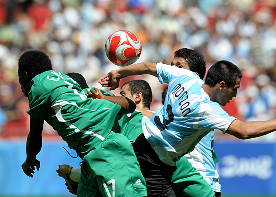 23日的鳥巢迎來了兩只雄鷹的對決:潘帕斯雄鷹阿根廷隊與非洲之鷹尼日利亞隊在北京奧運會男足決賽中相遇。在似火驕陽下鏖戰90分鐘之后,衛冕冠軍阿根廷隊最終憑借迪·瑪利亞的一記輕巧吊射敲開勝利之門,以1:0擊敗對手奪冠。 這一勝利不僅幫助阿根廷隊成功復仇亞特蘭大奧運會決賽最后一刻被尼日利亞隊入球擊敗之仇,同時實現了他們的衛冕之夢,而且也幫助阿根廷在北京奧運會上繼場地自行車項目之后奪得第二金。 比賽在正午12點鳴哨。擁有梅西、阿奎羅與里克爾梅這前場三叉戟的阿根廷隊自比賽開始后便頻頻利用短傳滲透不斷發起進攻,但對手在禁區前沿密集的防守成為阿根廷人推進中無法逾越的屏障。反而是尼日利亞隊的幾次反擊打得有聲有色,幾腳遠射也頗見功力。焦灼的比賽在正午的驕陽下進行了30分鐘后,雙方人馬勞頓,來自匈牙利的主裁維克托也見機行事,默許雙方球員集體來到場邊飲水解渴。此后的15分鐘內,雙方都無破門良機,互交白卷。 阿根廷隊在下半場的比賽中戰術上出現了一定的變化,隊形有所收縮,防反意圖明顯。這一戰術在58分鐘時獲得成效:效力于葡萄牙本菲卡隊的瑪利亞在中線附近接梅西后場傳球時,已經撕破了對方前壓的后衛線,之后他一路狂奔近20米,直到面前出現沖上前來的對方門將,他隨即起腳輕巧吊射,皮球在對方門線前落地彈起飛入網窩。 大約70分鐘時,場上再度出現全體球員暫停喝水的有趣一幕。此后,尼日利亞隊集體壓上,不斷在阿根廷隊門前制造殺機,尤其以71分鐘時禁區線上的遠射和84分鐘時近門柱的捅射威脅最大。但阿根廷人沒有再給對手以重現歷史的機會,1:0的比分保持到了終場。 比賽臨近結束,梅西被替換下場,獲得了單獨享受全場8萬9千余名球迷歡呼的榮耀。而當現場屏幕出現看臺上觀戰的馬拉多納時,全場觀眾再度給予了熱烈的呼喊。 奪冠后的阿根廷隊興奮異常,在頒獎儀式后久久地在鳥巢里跳躍著歡慶勝利。而尼日利亞隊主帥亞亞落寞地說,“對于這樣的結果我感到非常失望,我們今天踢得非常好,只是沒有取得進球而已,但比賽比的就是進球!