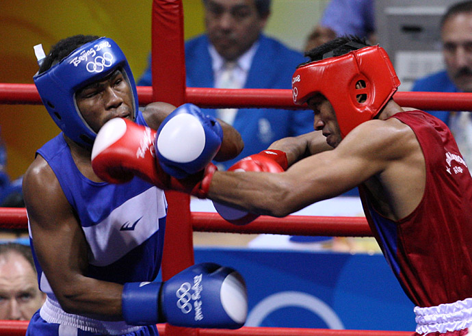 多米尼加選手費利克斯·迪亞斯(左)在北京奧運會拳擊64公斤級決賽中戰勝泰國選手瑪努·汶尊儂,獲得冠軍。
